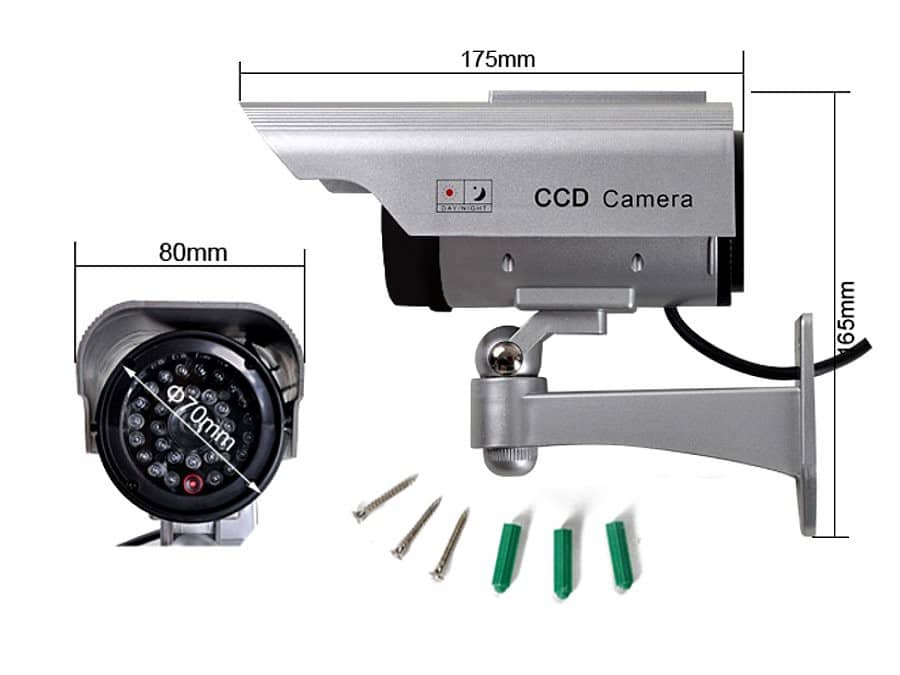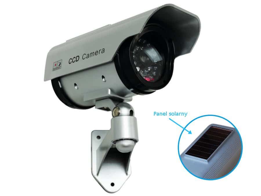 Atrapa kamery z migającą diodą oraz wbudowanym panelem solarnym!Bardzo wierna kopia oryginalnej kamery z imitacją diód IR i diodą świecącą na czerwono. Jej wykonanie cechuje się wysoką jakością użytych materiałów i dbałością o szczegóły. Całość wygląda bardzo realistycznie, nawet instalator kamer z wieloletnim doświadczeniem nie jest w stanie odróżnić czy to prawdziwa kamera czy atrapa. Dzięki panelowi solarnemu nie musisz się martwić o akumualtorki, ponieważ będą ładowane codziennie przez panel (zasilanie: panel solarny, lub dodatkowe akumulatorki AA nie dołączone do zestawu).GRATIS NAKLEJKA – UWAGA OBIEKT MONITOROWANY!Migająca czerwona dioda LEDDioda elektroluminescencyjna, dioda świecąca, LED (ang. light-emitting diode) dioda zaliczana do półprzewodnikowych przyrządów optoelektronicznych, emitujących promieniowanie w zakresie światła widzialnego, podczerwieni i ultrafioletu. W naszej atrapie zastosowana w celu jeszcze wiekszej skuteczności działania samej atrapy. Migajacy element w postaci diody LED zwraca uwagę rzucając się w “oko”. Główna istota takiego rozwiazania jest w pełni skuteczna w nocy bądź ciemnych pomieszczeniach.Materiał obudowy: ABSABS (poli(akrylonitryl-co-butadien-co-styren)) tworzywa sztuczne otrzymywane w procesie polimeryzacji butadienu oraz kopolimeryzacji akrylonitrylu ze styrenem wraz z jednoczesnym szczepieniem powstałego kopolimeru na polibutadienie. Tworzywo amorficzne. Gęstość 1,05 g/cm3. Duża udarność, twardość oraz odporność na zarysowania. Właśnie takie tworzywo zastosowano w produkcji naszej atrapy, gwarancją tego jest wielka odporność na zarysowania oraz możliwość stosowania na zewnątrz budynków, gdzie atrapa jest narażona na warunki atmosferyczne.Imitacja diod IR (podczerwień)Podczerwień (promieniowanie podczerwone) (ang. infrared, IR) promieniowanie elektromagnetyczne o długości fal pomiędzy światłem widzialnym a falami radiowymi. Oznacza to zakres od 780 nm do 1 mm. Podczerwień stosowana jest w noktowizji. Światło diod podczerwonych stosowane jest w nocy i ciemnych pomieszczeniach, dzięki niemu kamery mogą rejestrować obraz w trudnych warunkach oświetleniowych. W naszej atrapie są to identyczne imitacje prawdziwych diod IR.Wbudowany panel solarnyOgniwo słoneczne, ogniwo fotowoltaiczne, ogniwo fotoelektryczne, fotoogniwo to element półprzewodnikowy, w którym następuje przemiana (konwersja) energii promieniowania słonecznego (światła) w energię elektryczną w wyniku zjawiska fotowoltaicznego, czyli poprzez wykorzystanie półprzewodnikowego złącza typu p-n, w którym pod wpływem fotonów o energii większej, niż szerokość przerwy energetycznej półprzewodnika. W naszej atrapie panel solarny pełni dwie role, ładowarki jeśli zostaną dołączone akumulatorki oraz zasilania diody LED jeśli ilość światła jest odpowiednia do tego celu.Specyfikacja- Źródło zasilania: panel solarny lub 2 akumulatory AA- Dodatkowe akumulatory AA (R-06) ładowane z panela solarnego (nie dołączone do zestawu)- Maksymalna pojemność dodatkowych akumulatorów: ok. 750mAh- Do zastosowań wewnętrznych i zewnętrznych- Materiał: ABS- Wymiary: 80mm x 175mm x 165mmZestaw zawiera- Atrapa kamery SOL1200- Elementy montażowe (śruby, kołki rozporowe)- Statyw do zamocowania atrapy- Naklejka “OBIEKT MONITOROWANY”- Wbudowany panel solarny- Oryginalne opakowanie- Dowód zakupuDo czego służy atrapa kamery?Atrapy kamer to urządzenia prewencyjne, które służą do odstraszania intruzów i potencjalnych złodziei. Atrapy kamer z wyglądu przypominają prawdziwe kamery, jednak nie pozwalają na generowanie i przekazywanie obrazu. W miejscach, w których budowa systemów telewizji przemysłowej jest nieopłacalna, atrapy kamer są doskonałym rozwiązaniem (z badań wynika, że sama obecność atrapy kamery jest w stanie skutecznie odstraszyć złodzieja).Największą skutecznością w działaniu cechują się atrapy kamer z czerwoną diodą LED (dzięki diodzie atrapa jest bardziej widoczna zwłaszcza nocą, w piwnicach, garażach, magazynach). Nasza atrapa dodatkowo posiada panel solarny, który zasila diodę jednocześnie po dołączeniu akumulatorków ładuje je, zapewniając pracę w nocy. Jest to bardzo praktyczne rozwiązanie ponieważ nie musisz się martwić o wymianę baterii jak te się wyczerpią.Cechy- Realistyczny wygląd – wysoka jakość użytych materiałów i dbałość o szczegóły- Wierna kopia oryginalnej kamery z imitacją diód IR i diodą świecącą na czerwono- Wbudowany panel solarny- Możliwość ładowania akumulatorów z panela solarnego- Do zastosowań wewnętrznych i zewnętrznych- Materiał: ABS- Wymiary: 80mm x 175mm x 165mm