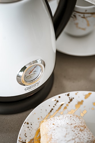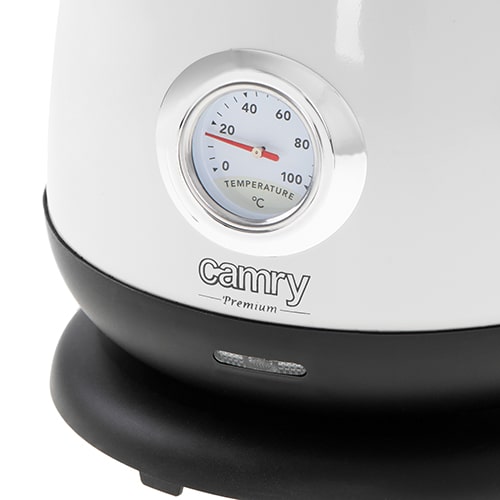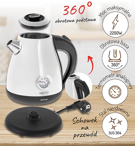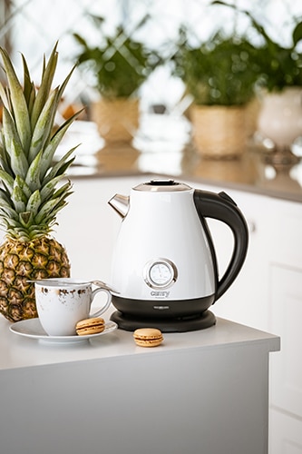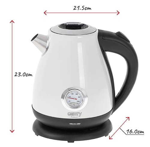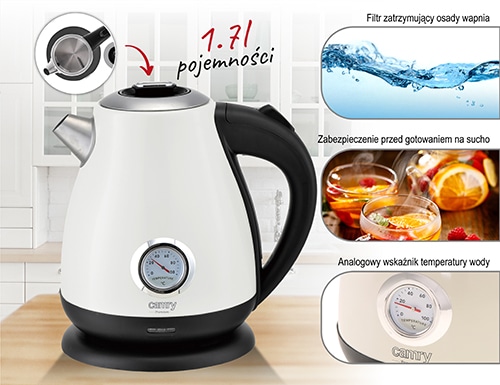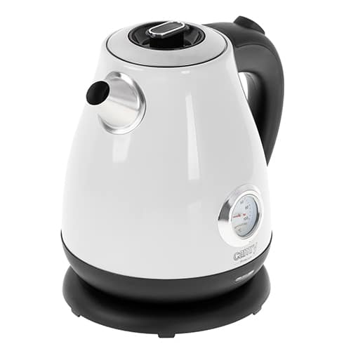 Klasyczny, 1,7-litrowy czajnik elektryczny z termometrem, przydatny w każdej kuchni. Jego bezpieczeństwo zapewnia blokada uniemożliwiająca włączenie pustego czajnika, oraz automatyczne wyłączenie po zagotowaniu wody. Funkcjonalność zwiększa stabilna podstawa i czytelny wskaźnik poziomu wody. Dysponuje mocą maksymalną 2200W i wykonany jest ze stali szlachetnej, co czyni go mistrzowskim rozwiązaniem, jeśli chodzi o szybkie gotowanie wody. Analogowy wskaźnik temperatury wody i smukły kształt to cechy, dzięki którym uzupełnisz wystrój pomieszczenia urządzonego w każdym stylu.