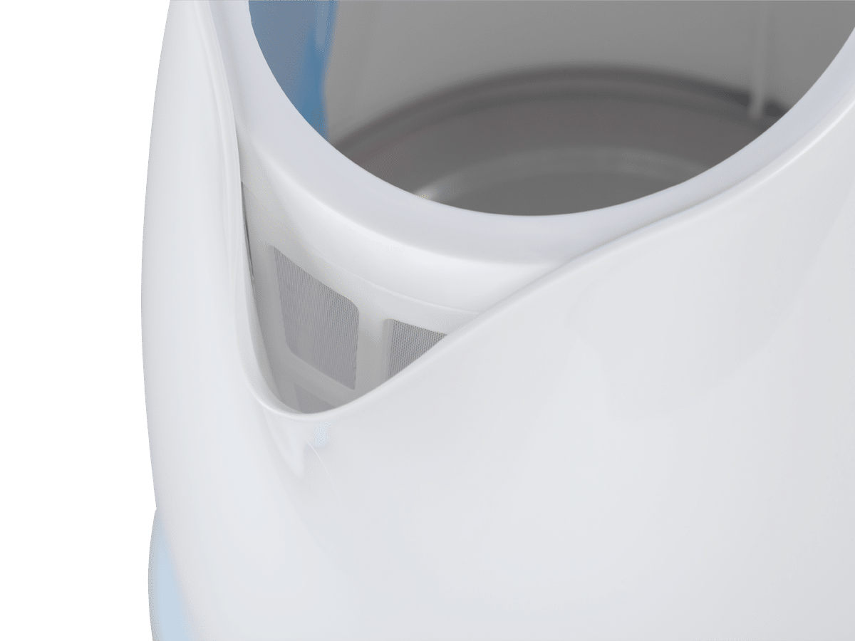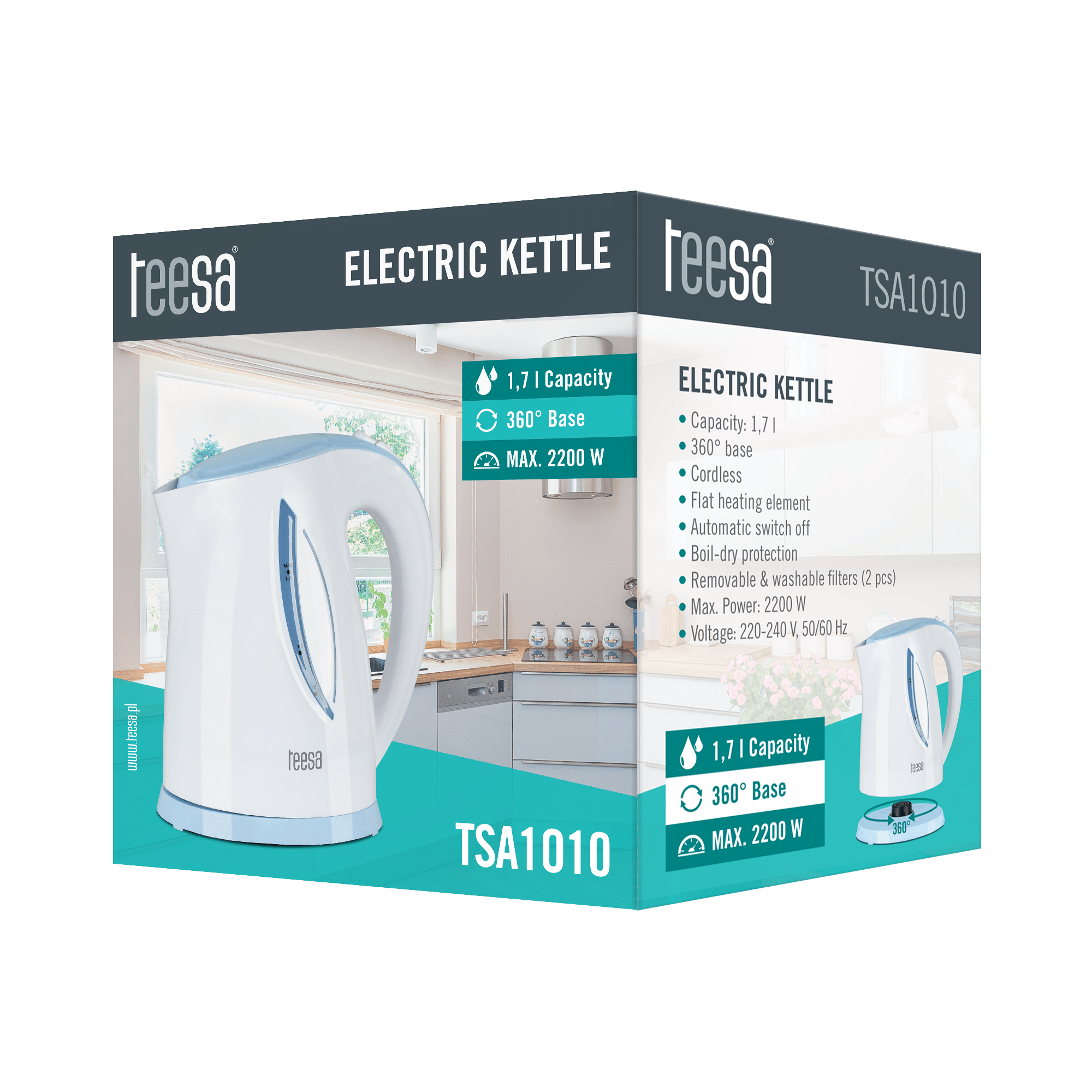TSA1010 to poręczny czajnik bezprzewodowy, którego pojemność wynosi 1,7 l. Urządzenie, dzięki białej obudowie z niebieskimi elementami wykończenia idealnie wkomponuje się w wystrój każdej kuchni, a wysokiej jakości tworzywo, z jakiego został wykonany sprawi, że będzie służył przez długi czas. Czajnik został wyposażony w zabudowaną, płaską grzałkę płytową, co zapewnia szybkie zagotowanie wody oraz ułatwia utrzymanie czystości urządzenia. Produkt posiada zabezpieczenie przed włączeniem bez wody oraz automatyczne wyłączanie, które zapobiega przegrzewaniu się. Obrotowa podstawa umożliwia ustawienie go w dowolnej pozycji, a wyjmowany filtr chroni przed wydostawaniem się kamienia, który powstaje podczas gotowania wody.