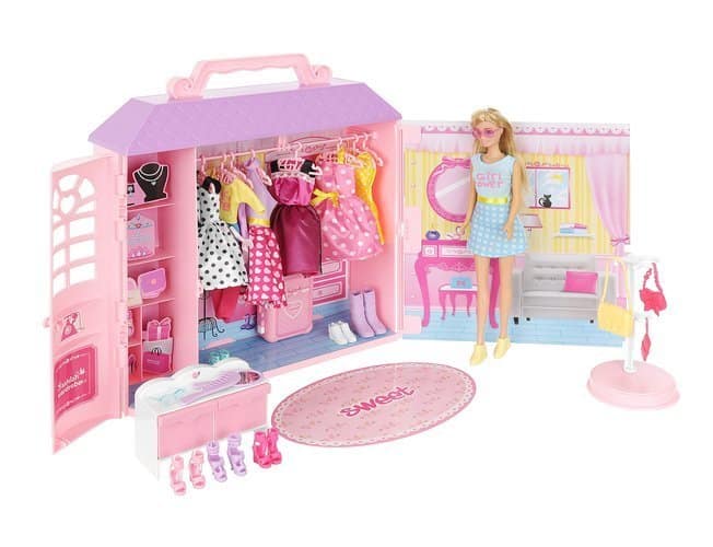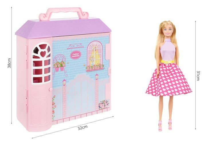 DOMEK Z UBRANKAMI + LALKA NA STOJAKU – ZESTAW XXLMNÓSTWO ZABAWY ? domek z ubrankami zawiera bardzo dużo różnego rodzaju elementów, więc daje dziecku wiele ciekawych możliwości zabawy. Lalę można przebierać, czesać, odgrywać wymyślone scenki itp.KREATYWNOŚĆ I WYOBRAŹNIA ? zestaw jest bardzo kolorowy i wykończony w najmniejszych szczegółach. Tworzenie bajecznie kolorowych stylizacji pobudza dziecięcą wyobraźnię i bardzo pozytywnie wpływa na kreatywność.NIC SIĘ NIE POGUBI ? szafa z ubrankami dla lalek jest zamykana, więc po skończonej zabawie można wszystko schować do środka, bez obaw, że któreś z elementów się pogubią.NAUKA UTRZYMANIA PORZĄDKU ? w zestawie znajdują się wieszaczki, na których można powiesić ubranka. Garderoba dla lalek posiada również miejsce na buty, półeczki na torebki itp. Każda rzecz w szafie z ubrankami dla lalek na swoje miejsce, więc dziewczynka uczy się utrzymania porządku.SPECYFIKACJA ? kolor: wielokolorowa; materiał: tworzywo sztuczne; wymiary szafy (wys/szer/gł): 38/32/11cm; wysokość lalki: 31cm; waga: 1,3kg; waga w opakowaniu: 1,7kg.SPECYFIKACJAkolor: wielokolorowa;materiał: tworzywo sztuczne;wymiary szafy (wys/szer/gł): 38/32/11cm;wysokość lalki: 31cm;waga: 1,3kg;waga w opakowaniu: 1,7kg.W ZESTAWIElalka,dywan,ilość stroi: 8,ilość butów: 7 par,2 pary okularów,8 wieszaków,3 torebki,lusterko,grzebień,komoda,walizka zamykana,domek zamykany.