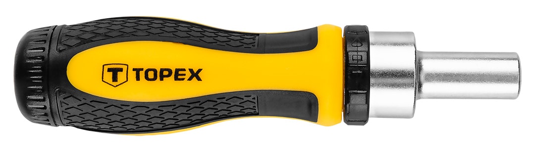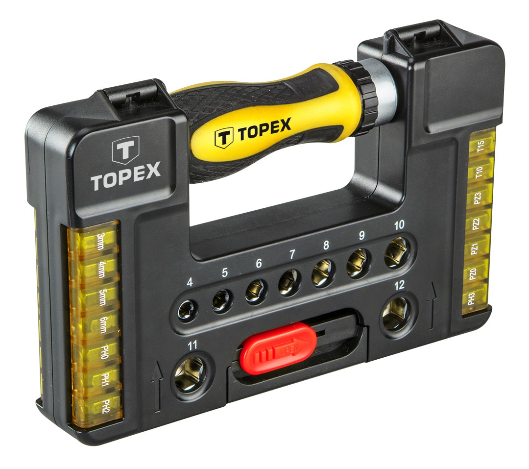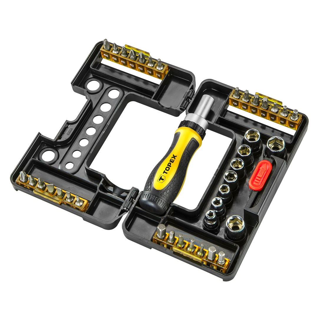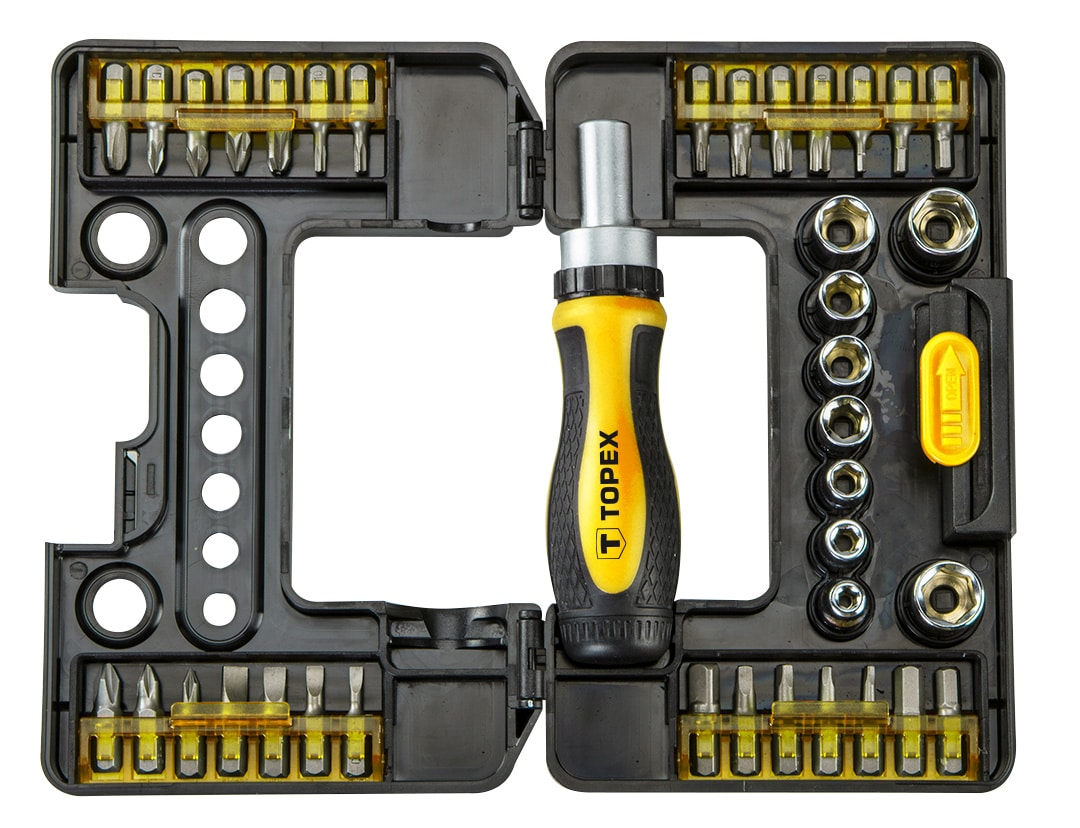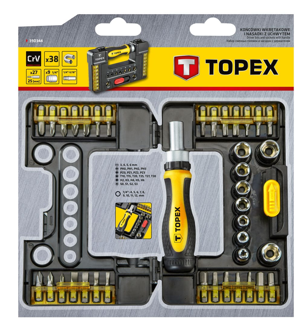 Końcówki wkrętakowe i nasadki z uchwytem (nr ref. 39D344, 1/4″, uchwyt wkętakowy magnetyczny z grzechotką, 1 adapter, 9 szt. nasadek, rozmiary: 4, 5, 6, 7, 8, 9, 10, 11 mm, 27 szt. końcówek wkrętakowych, rozmiary; płaskie: 3, 4, 5, 6, mm, krzyżowe PH0, PH1, PH2, PH3, PZ0, PZ1, PZ2, PZ3, Torx: T10, T15, T20, T25, T27, T30, Hex H2, H3, H4, H5, H6, S0, S1, S2, S3 stal CrV, opakowaniie plastikowe