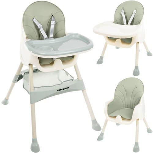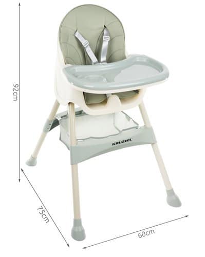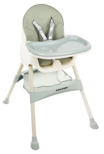 KRZESEŁKO DO KARMIENIA DZIECKA KRUZZEL 3w1DLACZEGO KRZESŁO 3w1? ? jest praktyczne, odpowiednie już gdy dziecko skończy 6 miesiąc życia, a co najważniejsze rośnie razem z dzieckiem. W odpowiedniej konfiguracji krzesełko jest wysokie, a co za tym idzie wygodne dla rodzica do karmienia, po zdemontowaniu nóżek staje się krzesłem dla większych dzieci, a po zdjęciu stolika i pasów staje się samodzielnym krzesełkiem.BEZPIECZEŃSTWO PRZEDE WSZYSTKIM – 5-cio punktowe pasy bezpieczeństwa oraz 4 antypoślizgowe stopki to jest to co zapewni bezpieczeństwo Twojemu maluszkowi. Z naszym krzesłem masz pewność, że posiadasz produkt: bezpieczny, prosty w użytkowaniu, który dodatkowo wpływa pozytywnie na komfort Twój i dziecka.ZDEJMOWANA TACA W ZESTAWIE ZE STOLIKIEM – stolik na krześle KRUZZEL jest regulowany w 3 stopniach, to idealne rozwiązanie dla dzieci, zapewnia im swobodę ruchów oraz brak skrępowania. Dodatkowo blat można całkowicie zdjąć. Na stolik można położyć tacę, do serwowania np. posiłku. Taca posiada wgłębienie na kubek / butelkę, jest łatwa w czyszczeniu oraz odporna na temperatury od -20 aż do 100 ?C. Co to znaczy dla Ciebie i Twojego maluszka? Możesz podać dziecku: lody, ciepłą zupkę, a nawet bardzo ciepłe mleko.SKŁADANE KRZESEŁKO, PODNÓŻEK ORAZ DUŻY KOSZ NA AKCESORIA ? oszczędność miejsca w domu. Krzesełka nie musisz zostawiać zawsze rozłożonego. Po bardzo prostym złożeniu, rozłożysz go w zaledwie kilka sekund bez konieczności używania innych narzędzi. Zatem gdy go nie używasz, złóż go do pozycji stojącej, żeby nie zajmował miejsca. Podnóżek zapewni dziecku wygodę w użytkowaniu. Kosz na akcesoria przyda się mamie, na wszystko co musi mieć “pod ręką”. Można tu przechowywać: zabawki, chusteczki, butelki itp.SPECYFIKACJA ? kolor: jasno zielony; materiał siedziska: PVC + wypełnienie: gąbka, szelki: POM, stolik/taca: PP, materiałowy kosz: poliester, nóżki: żelazo + PP;  wiek: 6m+; max obciążenie do 15 kg; pięciopunktowe pasy bezpieczeństwa: tak z możliwością demontażu; regulowany blat: tak w 3 stopniowym zakresie z możliwością demontażu; nakładana tacka do serwowania: tak z wgłębieniem na kubek / butelkę; tapicerka z eko skóry: tak łatwa do utrzymania w czystości z możliwością demontażu; podnóżek: tak; kosz na akcesoria: tak; montaż: z blokadami “na klik”; antypoślizgowe stopki: tak; 3w1: tak; blat i tacka odporna na temperatury w zakresie: -20 do 100 ?C; wysokość siedziska od ziemi po rozłożeniu: 55cm; wymiary siedzenia: 32 x 22-30 cm; wymiary (wys/szer/gł): 60-92/60/75cm; waga: 4,5 kg; waga w opakowaniu: 6 kg.SPECYFIKACJAkolor: jasno zielony;materiał siedziska: PVC + wypełnienie: gąbka, szelki: POM, stolik/taca: PP, materiałowy kosz: poliester, nóżki: żelazo + PPwiek: 6m+;max obciążenie do 15 kg;pięciopunktowe pasy bezpieczeństwa: tak z możliwością demontażu;regulowany blat: tak w 3 stopniowym zakresie z możliwością demontażu;nakładana tacka do serwowania: tak z wgłębieniem na kubek / butelkę;tapicerka z eko skóry: tak łatwa do utrzymania w czystości z możliwością demontażu;podnóżek: takkosz na akcesoria: tak;montaż: z blokadami “na klik”;antypoślizgowe stopki: tak;3w1: tak;blat i tacka odporna na temperatury w zakresie: -20 do 100 ?C;wysokość siedziska od ziemi po rozłożeniu: 55cmwymiary siedzenia: 32 x 22-30 cm;wymiary (wys/szer/gł): 60-92/60/75cm;waga: 4,5 kg;waga w opakowaniu: 6 kg.Krzesełko 3w1 KRUZZEL to idealne rozwiązanie podczas codziennych posiłków Twojego dziecka. Fotel jest lekki, miękki i prosty w użytkowaniu. Krzesło jest odpowiednie kiedy dziecko skończy 6 miesiąc życia. Posiada zdejmowaną tapicerkę z praktycznej eco skóry, która jest łatwa w czyszczeniu i wygodna w użytkowaniu. Blat posiada 3 poziomy regulacji odległości oraz zdejmowaną tackę. Dodatkowym atutem 4 antypoślizgowe nóżki z odpowiednim rozstawem zapewniając stabilność krzesełka. Dodatkowy wyprofilowany element zabezpieczający miedzy nóżkami, uniemożliwiający dziecku wyślizgnięcie się z krzesełkaDzięki 5-punktowym pasom możesz zapewnić dziecku bezpieczeństwo nie ograniczając mu ruchów. Krzesełko KRUZZEL zostało zaprojektowane z myślą o bezpieczeństwie i wygodzie Twojej i Twojego dziecka! Dopasowuje się do wieku, potrzeb i umiejętności malucha.