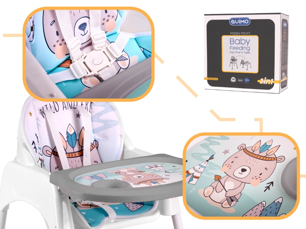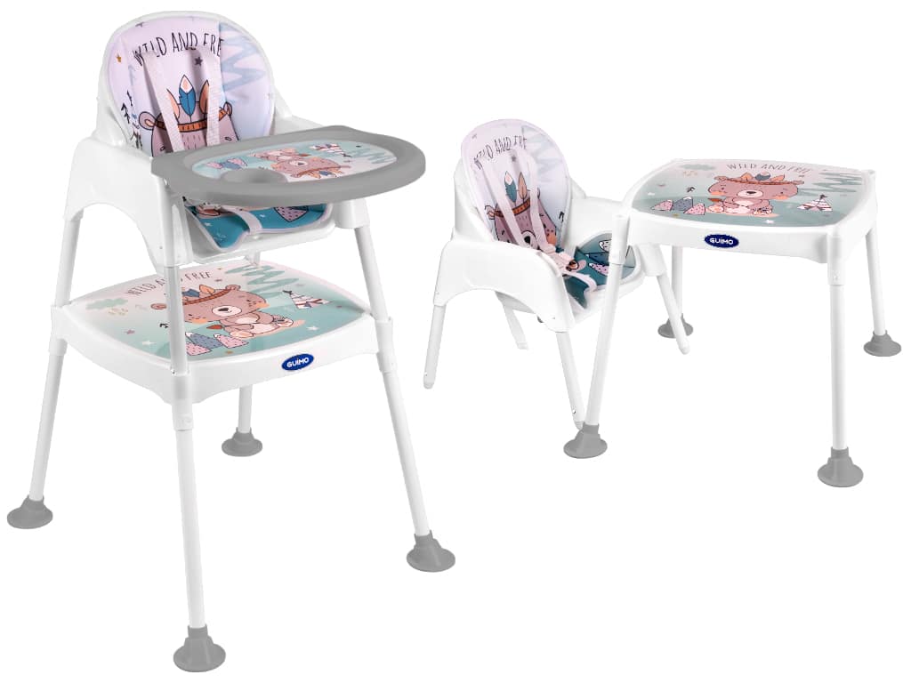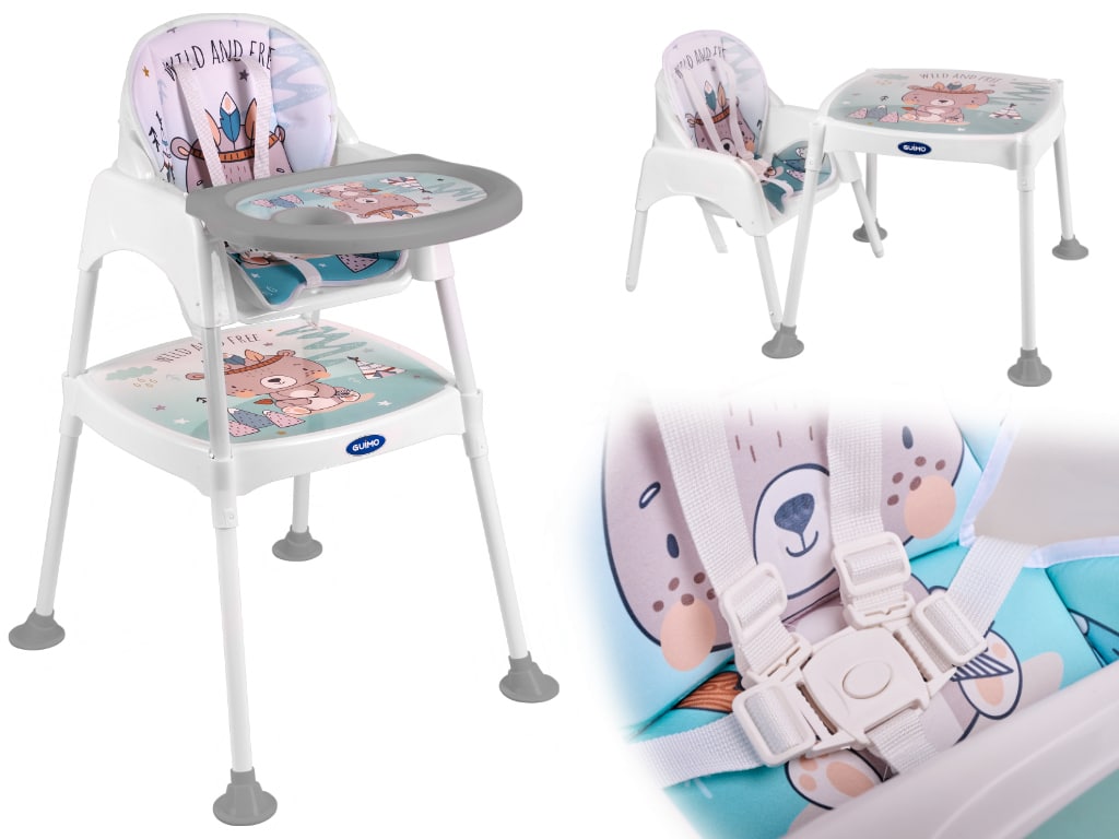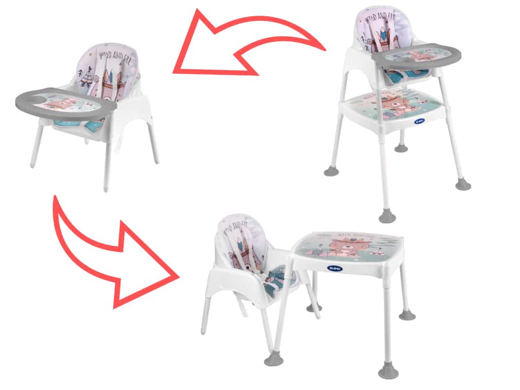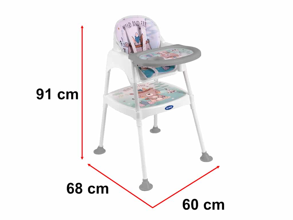 Super krzesełko do karmienia 3w1. Posiada trzy różne funkcje: krzesełka do karmienia, krzesełka i stolika. Śliczny design przyciągnie uwagę malucha. Miękkie pokrycie zapewni maluchowi wygodny posiłek. Wym. blatu stolika: 45×47,5cm. Wys. krzesełka: 91cm.