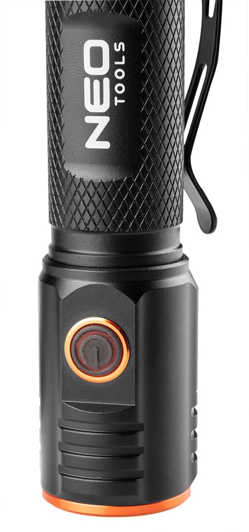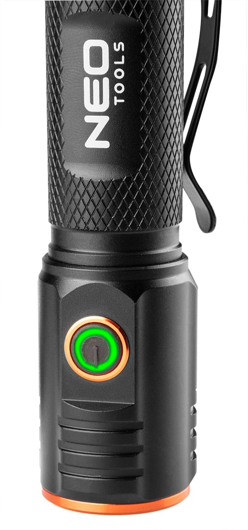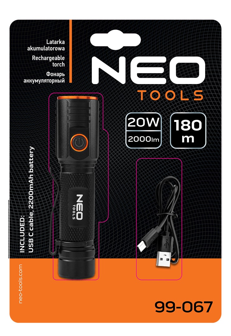 Latarka akumulatorowa USB C 2000 lm, 20W, CHN LED, zasięgu 180m, wskaźnik naładowania baterii, wskaźnik ładowania, akumulator li-ion 3.7V 2200mAh, magnes, aluminiowy korpus, przewód USB C, zaczep na kieszeń, anodyzowana powierzchnia korpusu, IPX6, czas ładowania 4h, czas pracy 4h, 5 funkcji działania 100% mocy czas pracy max 20 sec, 30%, 10%, 3%, strobe.