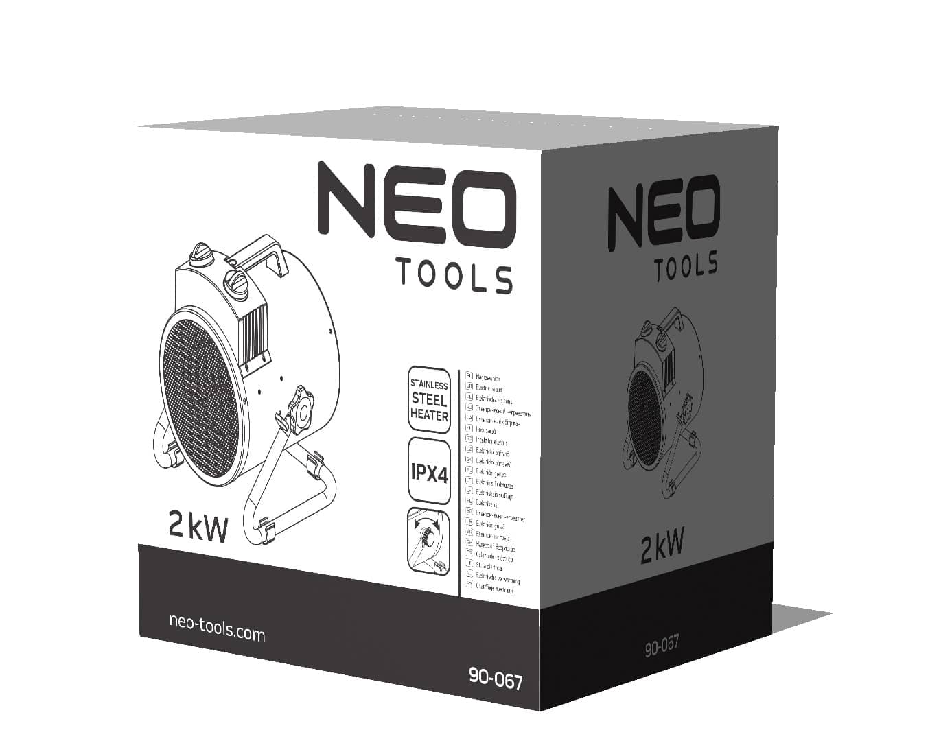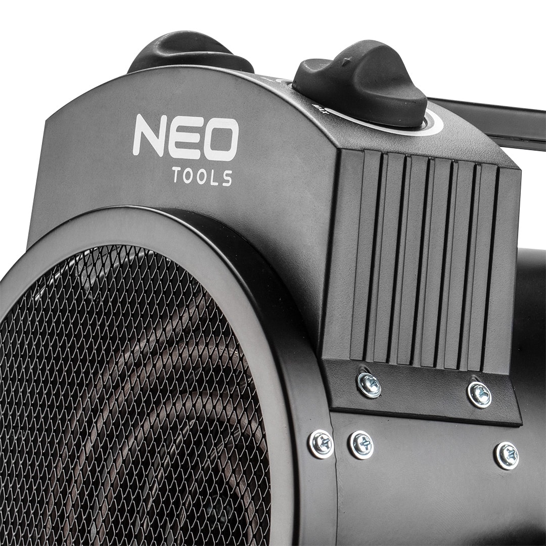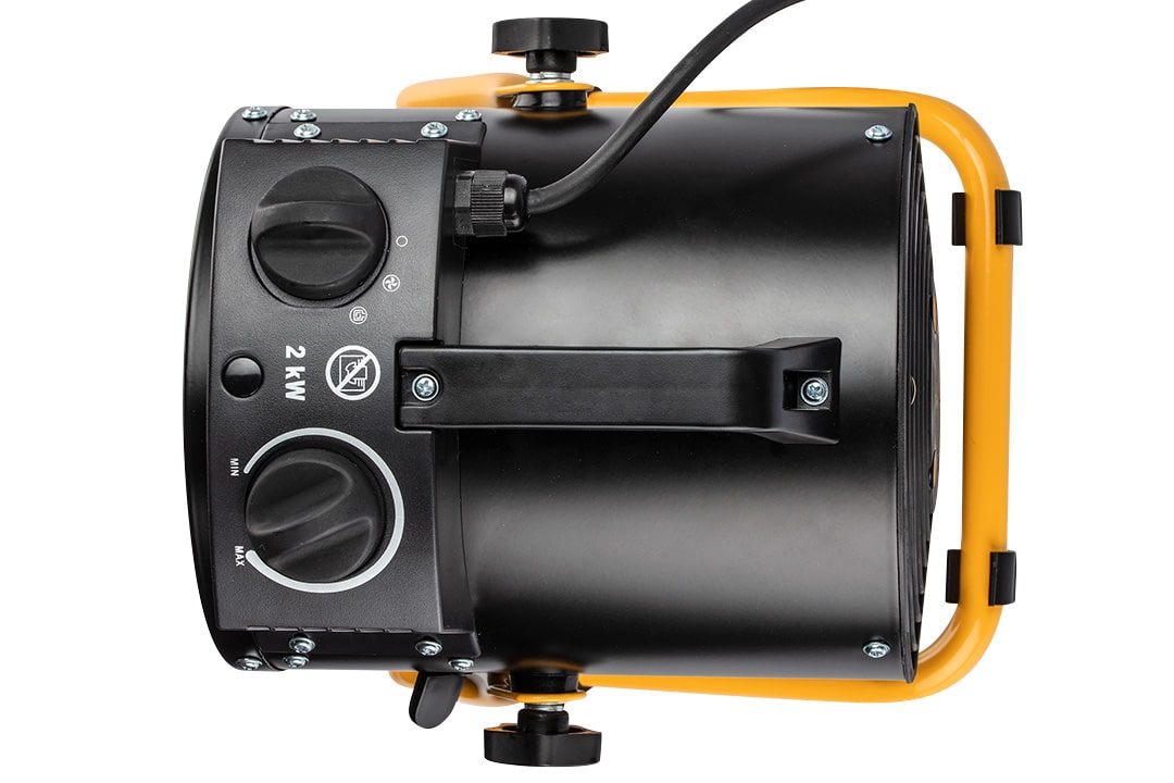 Nagrzewnica elektryczna 2kW przemysłowa, element grzewczy stal nierdzewna, regulowany termostat, ochrona przed przegrzaniem, z wentylatorem, regulowany kąt ustawienia, izolowany uchwyt, IPX4 do uzytku w wilgotnych obszarach, przepływ powietrza 330 m3/h
