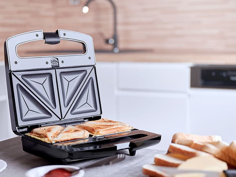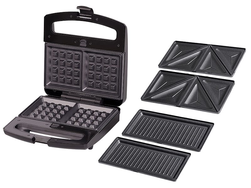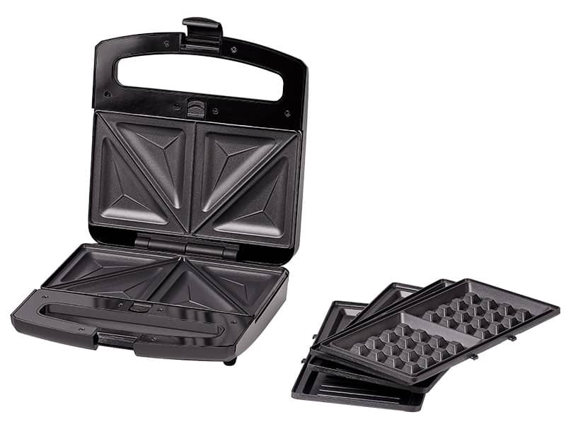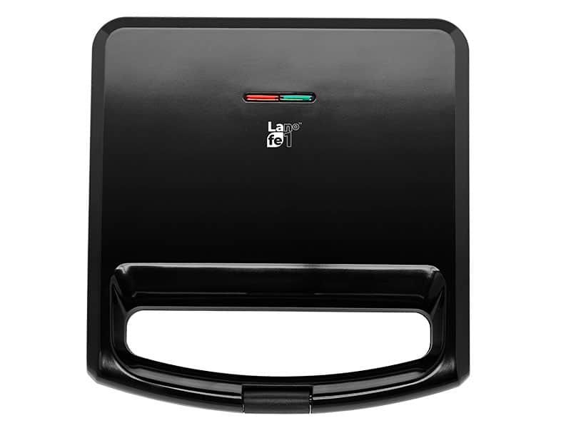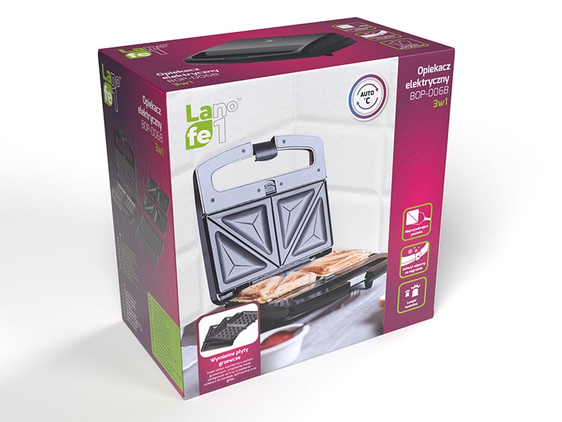Opiekacz LAFE BOP-106B to tak naprawdę trzy urządzenia w jednym – łatwo wymienne płyty pozwalają na upieczenie różnych prostych potraw. Zależnie od zainstalowanych płyt grzewczych możesz w prosty i szybki sposób przygotować klasyczne ?gorące kanapki?, słodkie gofry lub potrawy z grilla.-Powłoka zapobiegająca przywieraniu.-Duża moc 800 W.-Diody wskazujące stan gotowości.-Nienagrzewający się uchwyt.Zawsze idealnie wypieczoneOpiekacz do kanapek Lafe wyposażony został w specjalny zatrzask blokujący, który odpowiada za dokładne zamknięcie urządzenia w trakcie przygotowywania kanapek. Dzięki temu nawet kanapki z dużą ilością składników będą równo wypieczone. Zatrzask zabezpiecza urządzenie również przed otwarciem podczas przechowywania.Łatwe czyszczenieZapomnij o ciężkim i czasochłonnym szorowaniu urządzenia po przypieczonym serze. Płyty urządzenia zostały pokryte specjalną nieprzywierającą powłoką, dzięki czemu łatwo utrzymać urządzenie w czystości.Dziecinnie prosta obsługa Opiekacz Lafe jest bardzo prosty w obsłudze. Zainstalowane dwie diody kontrolne wskazują stan urządzenia: czerwona wskazuje, że urządzenie jest podłączone do sieci i nagrzewa się, natomiast zielona kontrolka informuje o tym, że już możesz układać na płytach grzewczych swoje ulubione kanapki.