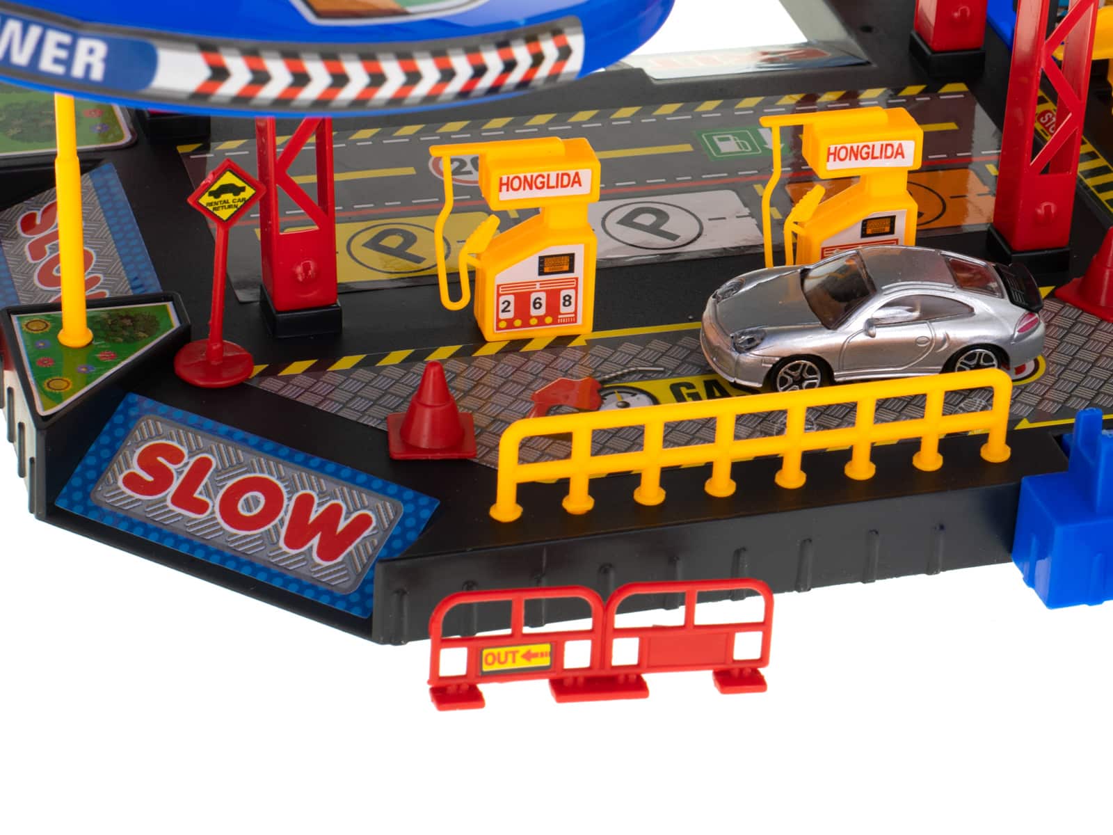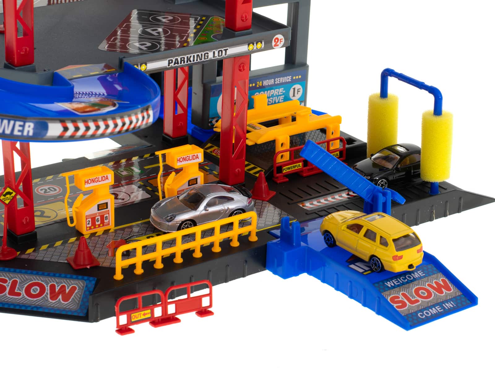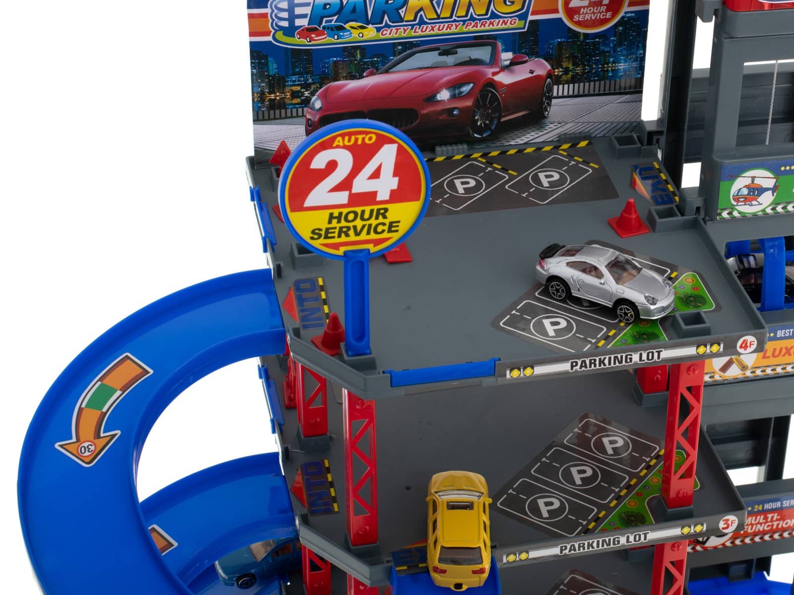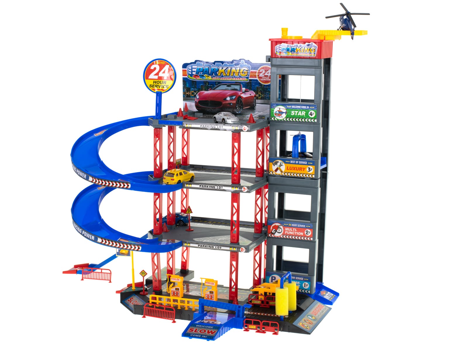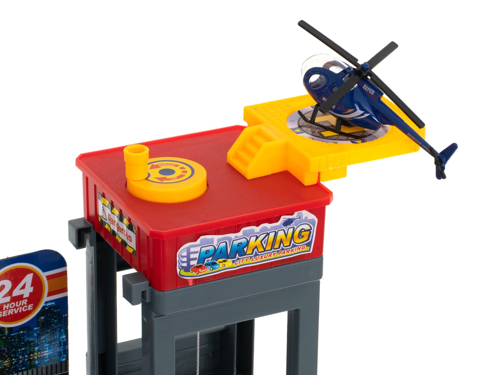 Parking wielopoziomowy z autami i helikopterem. Przypadnie do gustu każdego chłopca. Zabawka rozwija umiejętności manualne i pobudza wyobraźnię dziecka. W zestawie: tor, 4 samochody, helikopter. Wymiary autka: 7x 2,5x2cm.