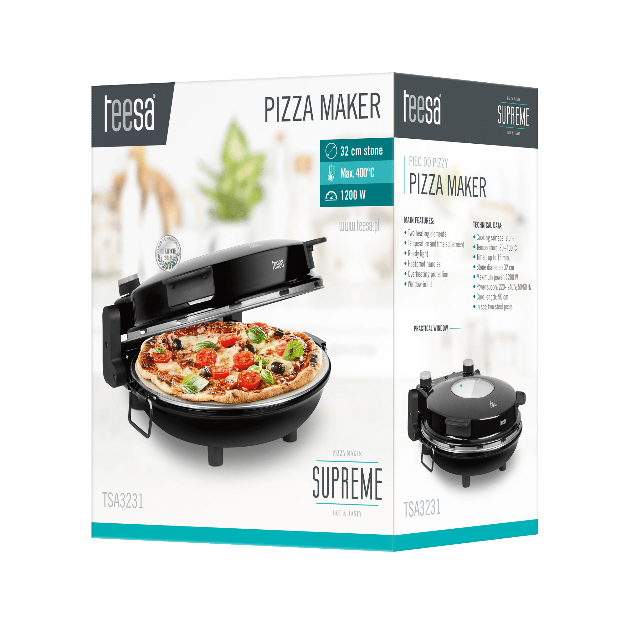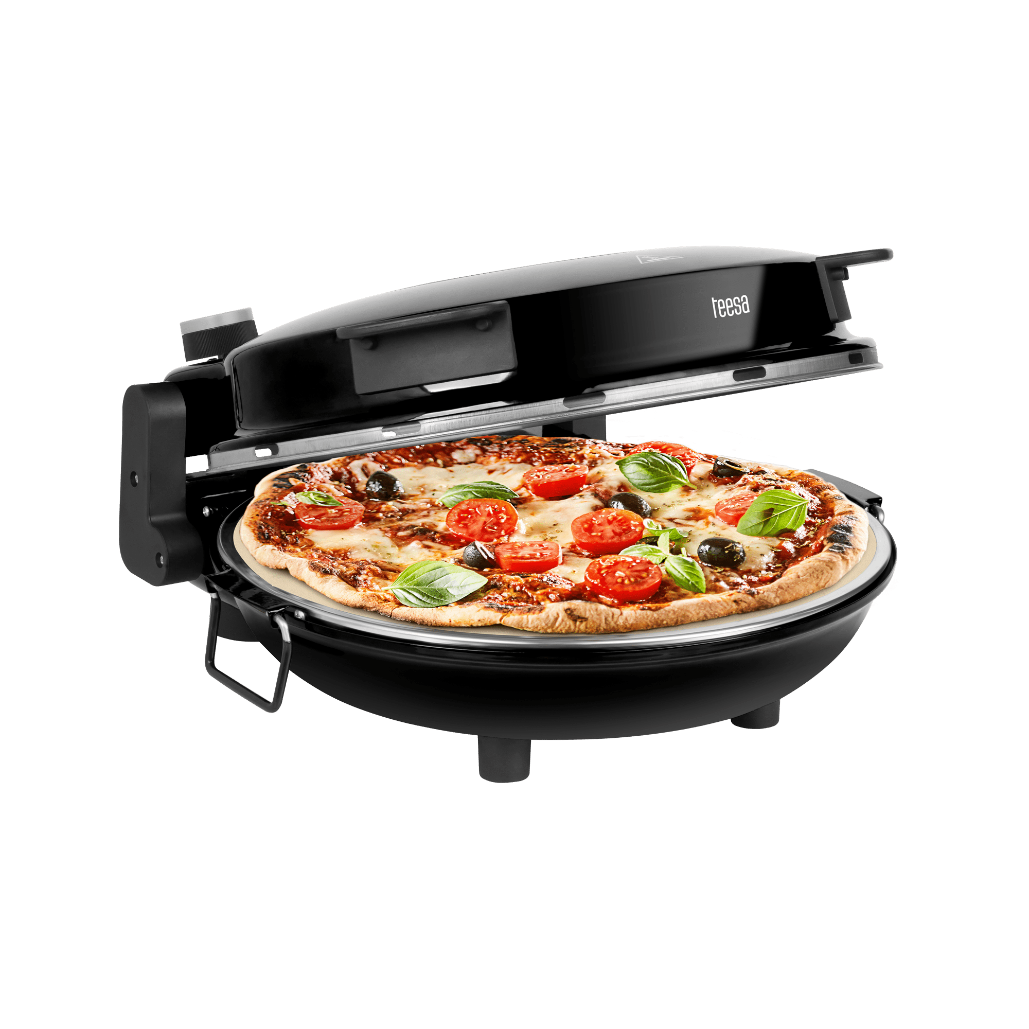 Domowy piec do pizzy Teesa SupremeKto nie lubi pizzy? Zwłaszcza takiej przygotowanej jak we włoskiej pizzerii, której sekretem jest cienki, dobrze wypieczony i chrupiącym spód! Pizza margarita, hawajska, pizza z rukolą czy wegetariańska – zapomnij o częstych wyprawach na miasto, niech Twoje podniebienie cieszy ulubiona pizza jak z pizzerii, przygotowana bez wychodzenia z domu. Pomoże Ci w tym domowy piec do pizzy Teesa Supreme.Pizza w kilka minutZastanawiasz się ile czasu zajmuje pieczenie pizzy? Domowy piec do pizzy Teesa, dzięki specjalnej konstrukcji wykorzystującej dwa elementy grzejne, doskonale i równomiernie wypiecze nie tylko ciasto, ale też ser i pozostałe składniki dosłownie w 5 minut. Możesz też wykorzystać go do przygotowania innych, nie tylko włoskich przysmaków!Idealny przepis na pizzę domowąSekretem uzyskania cienkiego i doskonale wypieczonego ciasta w piecu Supreme jest wykorzystanie ceramicznego kamienia, który rozkłada równomiernie ciepło, utrzymuje bardzo wysoką temperaturę oraz pochłania wilgoć. W efekcie jego działania uzyskasz chrupiący spód, który stanie się Twoją bazą. Wykorzystaj swoje ulubione przepisy na pizze włoską i ciesz się ucztą dla podniebienia.Okienko w pokrywieLubisz mieć wszystko pod kontrolą? Pokrywa pieca Teesa Supreme została wyposażona w praktyczne okienko, dzięki któremu możesz stale sprawdzać jak dużo czasu jeszcze potrzeba, aby pizza była gotowa do podania.Domowa pizza jak z pizzeriiNiezależnie od tego, czy wolisz pizzę na grubym cieście, czy preferujesz wersje na cienkim spodzie, domowy piecyk do pizzy Teesa spełni Twoje wymagania. Pokrętło regulacji temperatury w zakresie od 80°C do 400°C oraz sygnalizacja czasu pracy to połączenie, dzięki któremu nie tylko poczujesz się jak pizzerman, ale uzyskasz prawdziwą włoską pizzę w domowym zaciszu.Bezpieczny piec do pizzyCzarna obudowa domowego pieca do pizzy Teesa Supreme, nadaje mu uniwersalności, która sprawdzi się w każdej kuchni. Zamieszczone na pokrywie nienagrzewające się uchwyty umożliwiają bezpieczne otwarcie pieca w każdym momencie pieczenia. Z kolei dzięki dwóm dołączonym do zestawu stalowym łopatkom Twoja pizza domowej roboty szybko i pewnie wyląduje na talerzu domowników.
