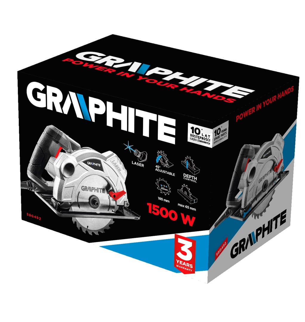 Pilarka tarczowa 1500W, tarcza 185×20 mm, obroty 5800 min, cięcie pod skosem 0-45 , gł. cięcia 65/43 mm (90/45 ), laser <1 mW, masa 4.3 kg, regulacja głębokości oraz kąta cięcia; akcesoria: prowadnica równoległa, klucz regulacyjny oraz tarcza do cięcia – 1szt.