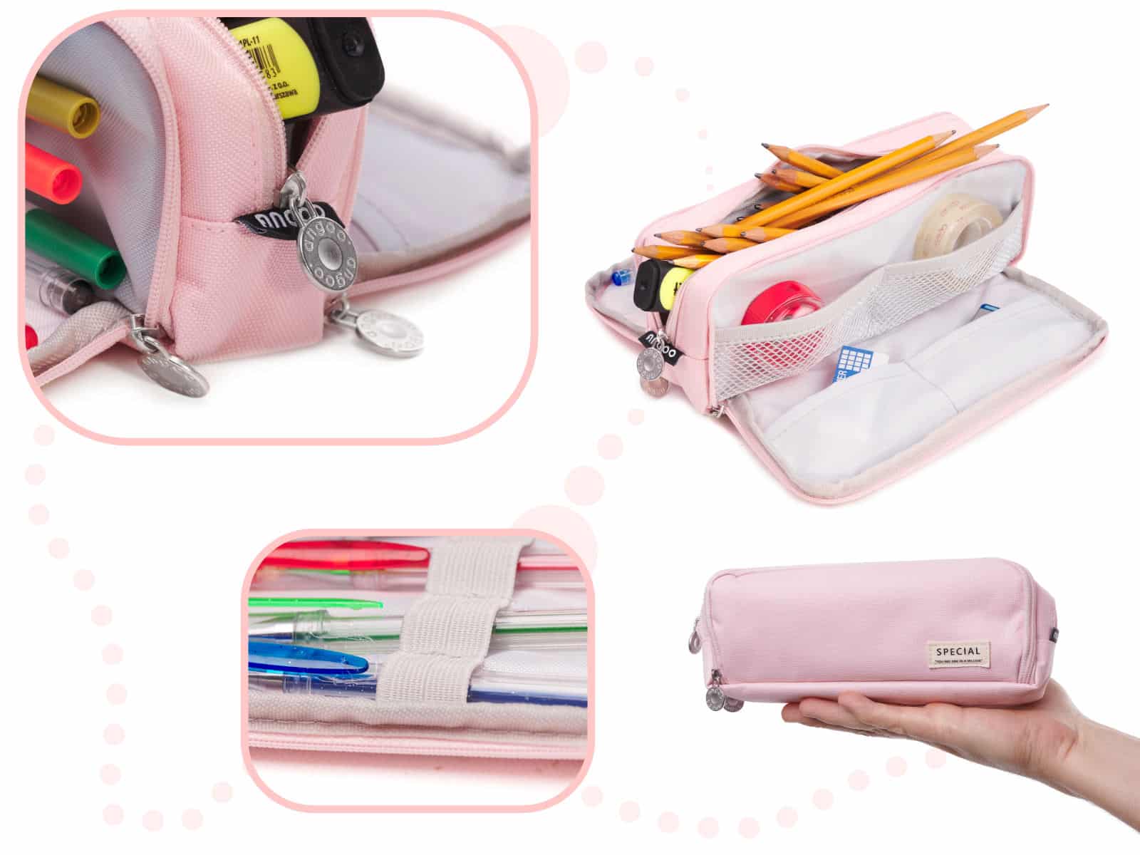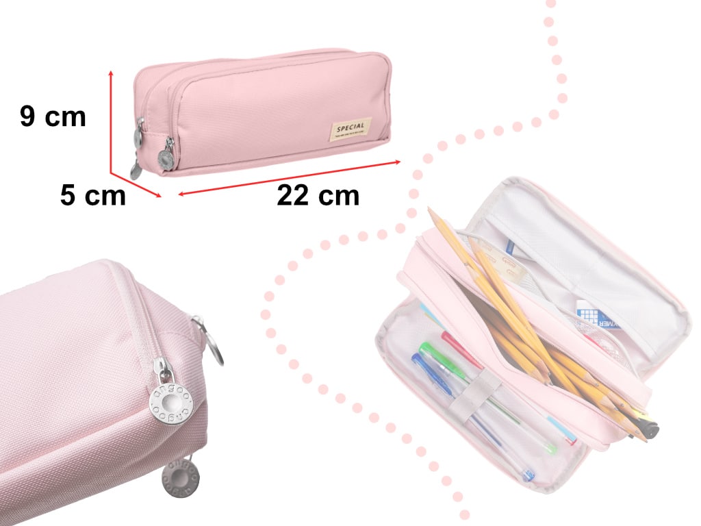 Rewelacyjny piórnik saszetka potrójna. Świetnie sprawdzi się również w roli kosmetyczki. Pojemna saszetka pomieści wszelkie niezbędne przedmioty. Ilość przegród: 3 zapinane na zamki błyskawiczne. Kolor: różowy. Tworzywo: poliester. Wym. piórnika: 22x5x9cm