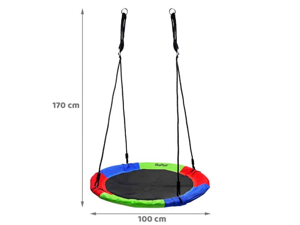 SkyFlyer Huśtawka ogrodowa Bocianie Gniazdo o średnicy 100cm sprawdzi się w każdym domowym placu zabaw. Huśtawka z pełnym okręgiem jest przeznaczona dla dzieci, osób do maksymalnej wagi 150kg. Wykonana z materiałów odpornych na warunki pogodowe. Może być montowana na tarasie, drzewie w ogrodzie, pokoju. Gniazdo posiada regulowaną długość lin, aby móc dostosować właściwą wysokość dla dziecka.Specyfikacja:- solidna metalowa rama obłożona pianką EVA- średnica siedziska 100 cm- maksymalne obciążenie 150kg- waga huśtawki 2,9 kg- regulowana długość lin 170 cm- grubość liny 1,3 cm- metalowe uniwersalne kółeczka do zawieszenia o średnicy 5 cm- łatwy montaż- regulowana długość lin do zawieszenia- kolor: czarna mata, niebiesko, zielono czerwone obszycie- materiał lin 100% PoliesterZestaw zawiera- huśtawka- lina do montażu- klucz- śrubkiOdpoczynek w ogrodzie na takiej huśtawce pozwoli na całkowity relaks. Nie ma to jak pobujać przez chwilę w obłokach na huśtawce.Przeznaczenie tylko do użytku własnego (domowego).