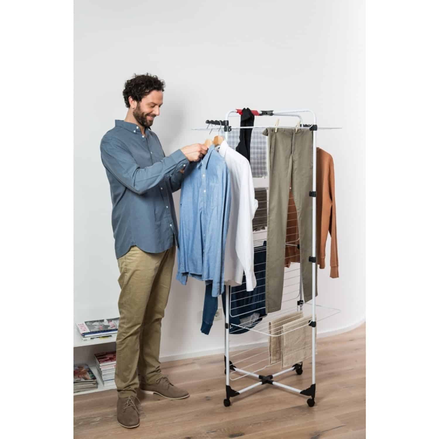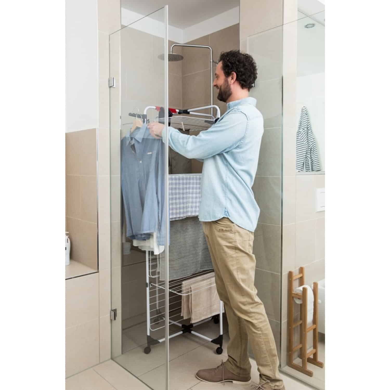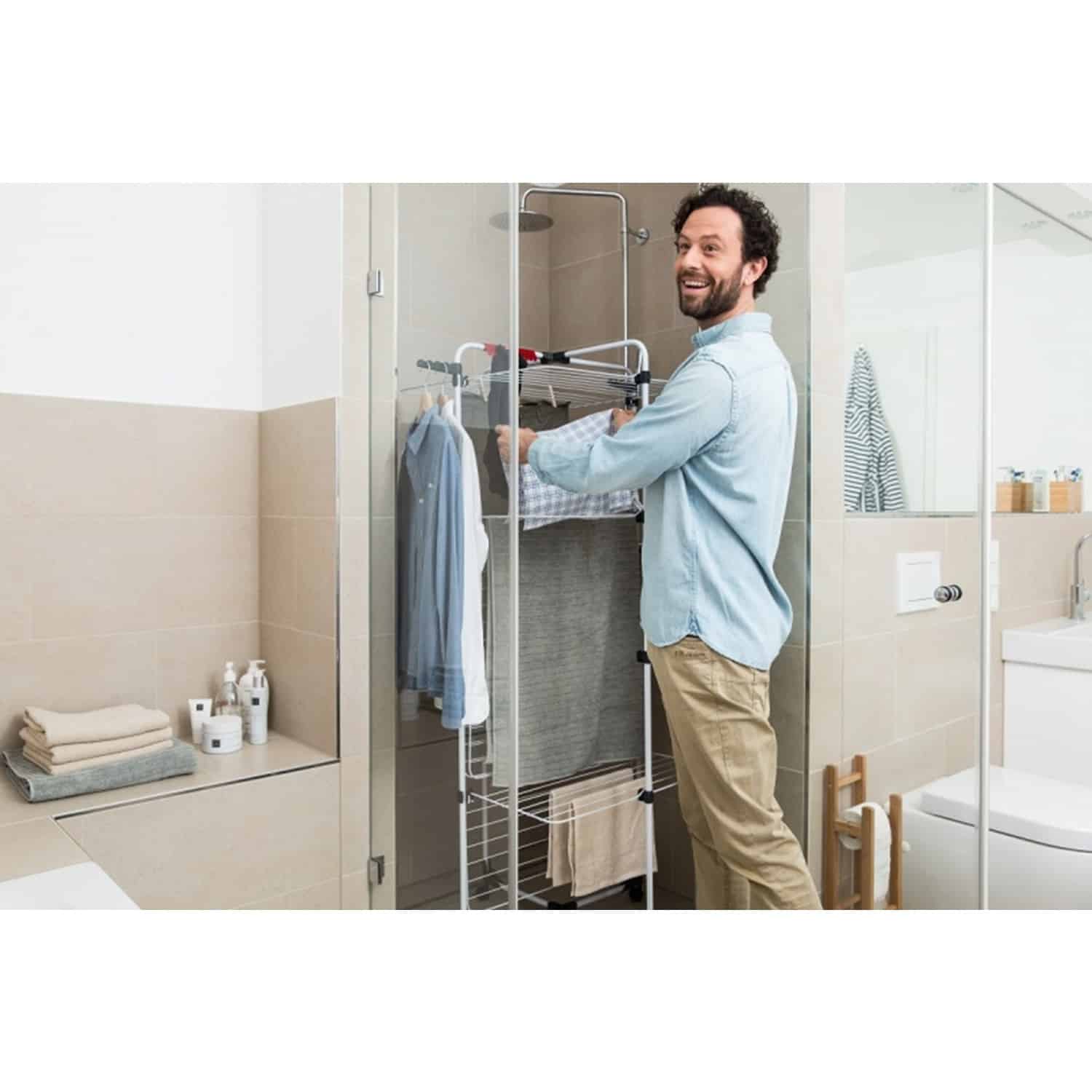 Suszarka na pranie Mixer 4 to czteropoziomowa suszarka stworzona na kształt wieży. Umożliwia one rozwieszenie bardzo dużej ilości prania pomimo małej przestrzeni. Ograniczenie przestrzeni możliwe jest dzięki wykorzystaniu struktury wieży. W efekcie możliwe jest rozłożenie jej w każdym pomieszczeniu, również w miejscach niestandardowych jak kabina prysznicowa. Suszarka wyposażona została w osiem niezależnych skrzydeł posiadających dodatkowe wsporniki. Dzięki dodatkowej regulacji możliwe jest przysunięcie suszarki do ściany.Suszarka pionowa na pranie posiada także nogi zakończone kółkami, co ułatwia przenoszenie suszarki. Suszarka wieżowa Mixer 4 jest bardzo stabilna, posiada także dwa uchwyty na wieszaki pozwalające rozwiesić dodatkowe pranie na przykład koszule. Wyposażona została także w wieszak na delikatne pranie.Specyfikacja- Wydajność suszenia: 40 m- Kolor: Srebrny/Czarny/Biały- Długość: 71 cm- Szerokość: 71 cm- Wysokość: 169 cmZestaw zawiera- Suszarka na pranie pionowa Vileda Mixer 4- Oryginalne opakowanie- Dowód zakupuCechy- Wysokość suszarki: 169 cm- Długość linek: 40 m- Wymiary po rozłożeniu: 71x71x169cm- Wymiary po złożeniu: 71x5x169cm- Stelaż wykonany w oparciu o stal powlekaną