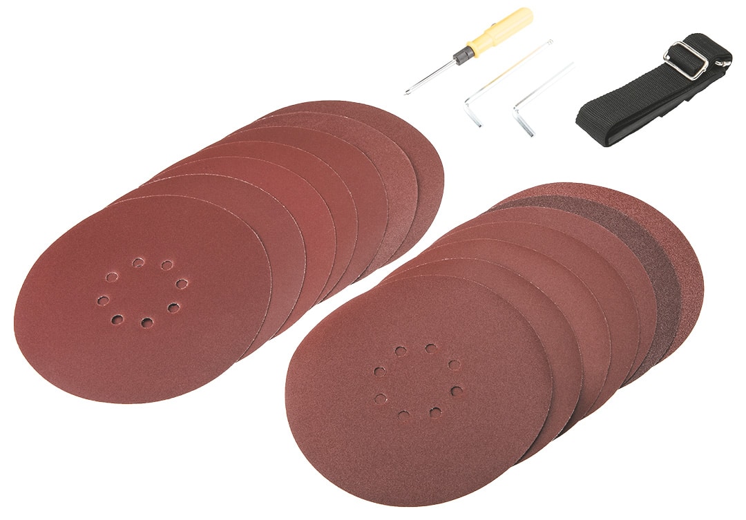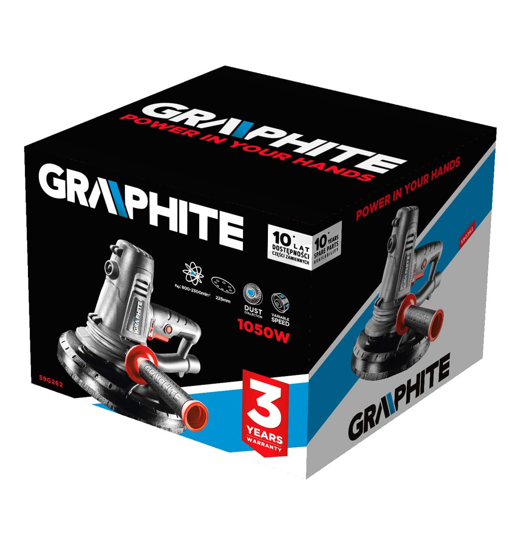 Szlifierka do gipsu 1050W, tarcza 225 mm, obroty 800-2300 min, worek na pył 25 l, system samoczynnego odsysania pyłu, wymiary urządzenia (LxWxH): 255x305x245 mm, masa 3.5 kg, przewód zasilający ogumowany 4 m, torba materiałowa, akcesoria: papier ścierny (2x P80, 2x P120, 2x P150, 4x P180, 4x P240) – 14 szt, wąż ssący – 1 szt, pas naramienny – 1 szt, worek na pył – 1 szt
