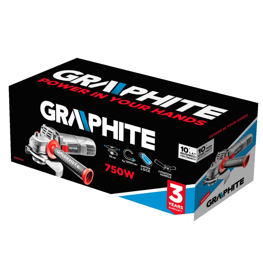 Szlifierka kątowa 750W, wąska obudowa, tarcza 115×22.2 mm, obroty 12000 min, gwint wrzeciona M14, dwustopniowy przycisk włącznika, dwupozycyjna rękojeść boczna, przycisk blokady włącznika, (LxH) 300 x 137 mm, masa 1.9 kg, akcesoria: osłona tarczy, klucz specjalny, rękojeść dodatkowa