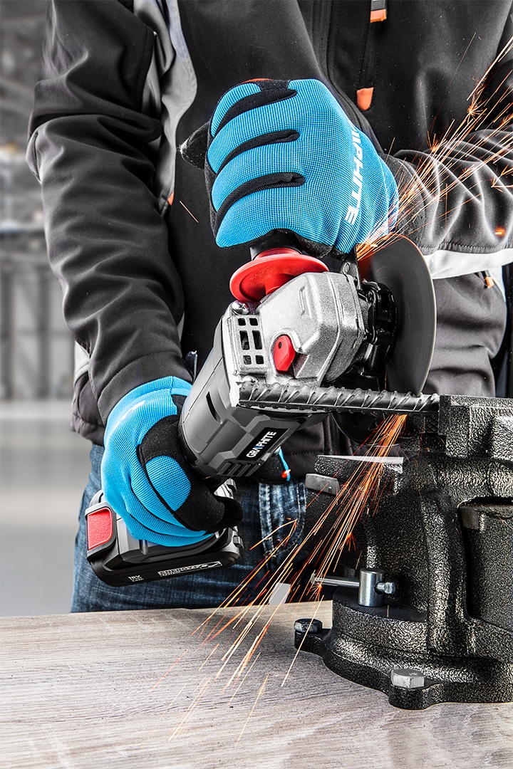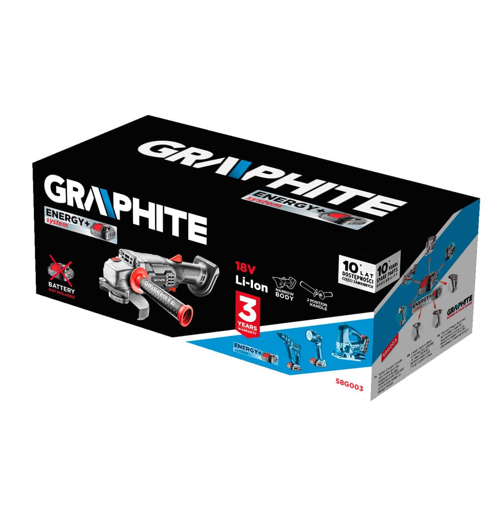 Szlifierka kątowa akumulatorowa 18V, Li-Ion, tarcza 115×22.2 mm, obroty 10000 min, gwint wrzeciona M14, dwupozycyjna rękojeść boczna, (LxH) 320 x 130 mm, masa 1.5 kg, kompatybilna z akumulatorami Energy+