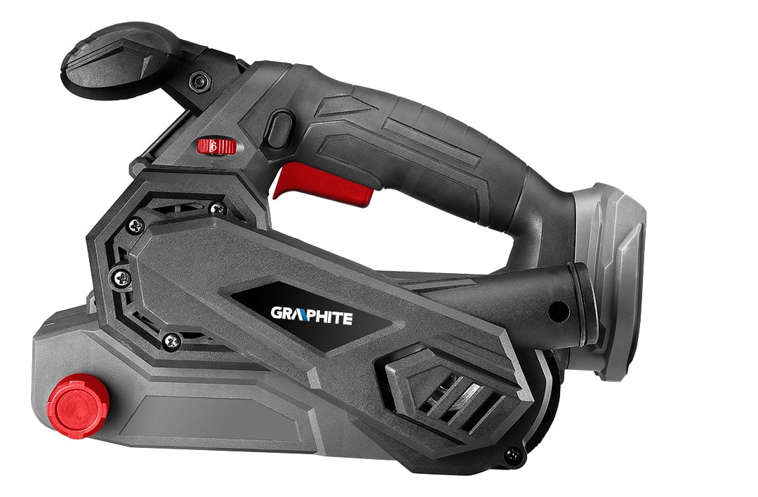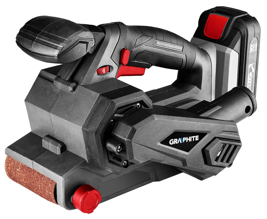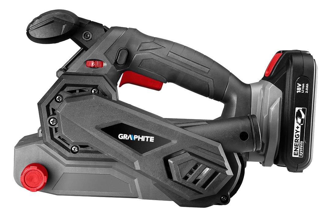 Szlifierka taśmowa akumulatorowa Energy+ 18V, prędkość przesuwu pasa ściernego 120-350m/min, prędkość obrotowa 16000 min-1, powierzchnia szlifowania 76 x 120 mm, rozmiar pasa ściernego 76 x 457 mm. Akcesoria: worek na pył, pas bezkońcowy, Waga 2,38 kg.