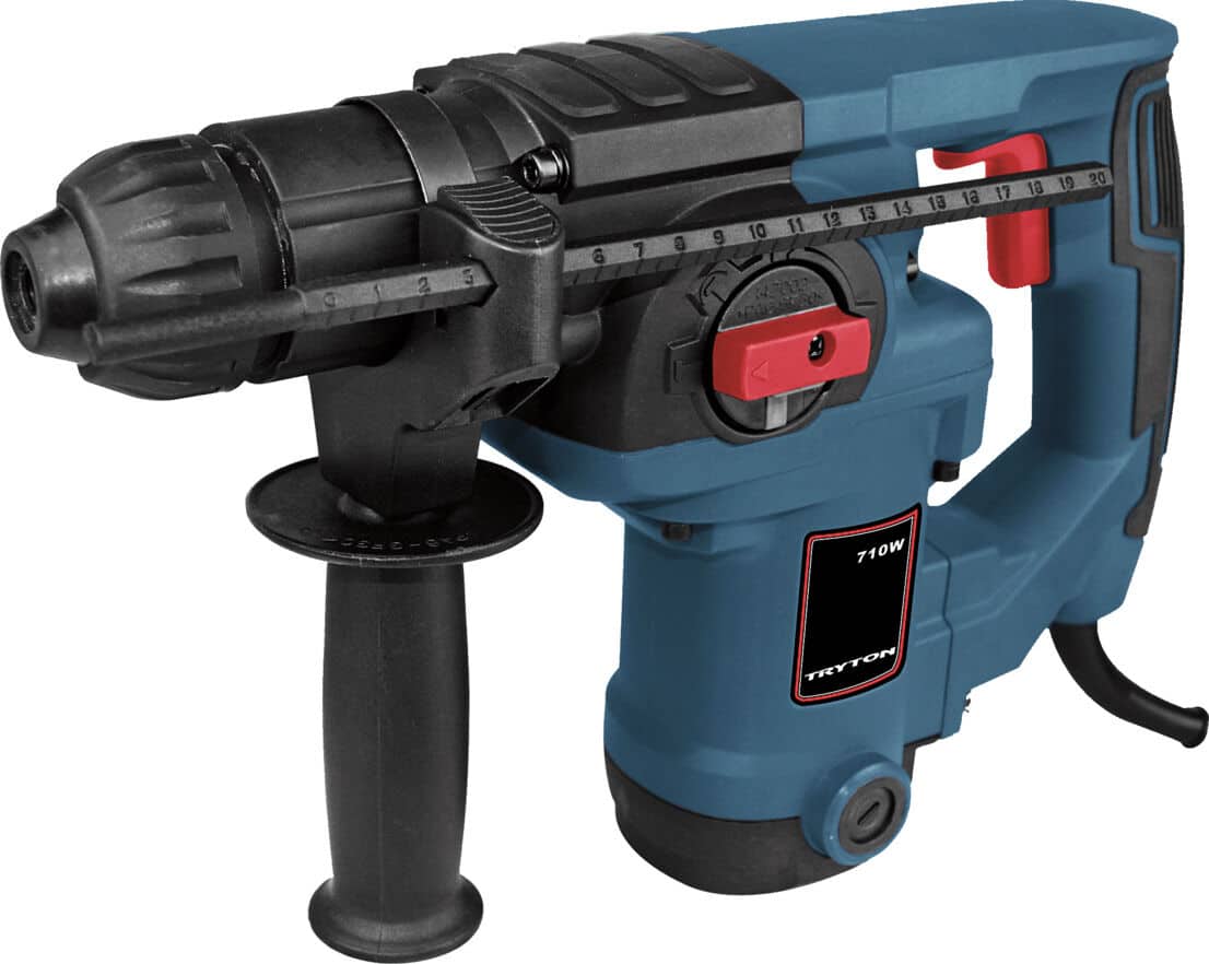 TMM710K Młotowiertarka 710W, SDS-plus, 4 funkcje, TrytonCechy:Doskonała ergonomiaPyłoszczelne łożyska toczneUtwardzana przekładnia i mechanizm udarowyWiercenie udaroweWiercenie bez udaruPodkuwanieWyposażenie:3 wiertła2 dłutarękojeść bocznaogranicznik głębokościkufer transportowyDane techniczne:moc 710 Wuchwyt sds-plusprędkość obrotowa 0-930 obr./min.energia udaru 2.6 Jczęstotliwość udaru 0-5000 1/min.maks. średnica wiercenia w betonie 26 mmmaks. średnica wiercenia w stali 13 mmmaks. średnica wiercenia w drewnie 40 mm