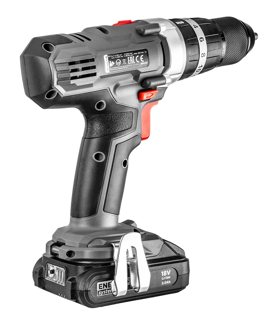 Szlifierka kątowa (58GE130) akumulatorowa 18V, Li-Ion. 10000 obrotów na minutę, gwint wrzeciona M14, średnica tarczy 125 mm, wewnętrzna średnica tarczy 22,2 mm. Akcesoria: osłona tarczy, kucz specjalny, rękojeść dodatkowa. Dwupozycyjny uchwyt boczny oraz blokada wrzeciona, bez kluczykowym montażem osłony. Masa 1,65 kg.Wiertarko-wkrętarka (58G010) akumulatorowa 18V, Li-Ion, obroty I: 0-350 min II: 0-1250 min, udar I: 0-5250 min-1 II: 0-18750 min-1, prawo/lewo, uchwyt samozaciskowy 2-13 mm, pozycje pierścienia sprzęgła 1-16 (oraz dodatkowy przełącznik wkręcania, wiercenia i wiercenia z udarem), moment obrotowy (miękki/twardy): 35/55 Nm, hamulec wrzeciona, (LxH) 230 x 220 mm, masa 1.3 kg.