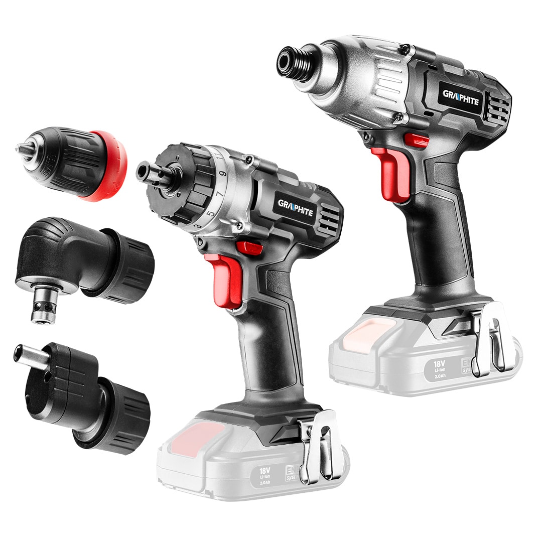 Wiertarko-wkrętarka (58G022-AD) akumulatorowa 18V, Li-Ion, obroty I: 0-350 min II: 0-1250 min, prawo/lewo, uchwyt samozaciskowy zdejmowany 0.8-10 mm, pod uchwytem gniazdo sześciokątne , pozycje pierścienia sprzęgła 1-16 (oraz opcja wiercenia), moment obrotowy (miękki/twardy): 28/44 Nm, hamulec wrzeciona, masa 1.1 kg. Akcesoria: szybko wymienny uchwyt, adapter kątowy, adapter krawędziowy.Zakrętarka (58G012) akumulatorowa 18V, Li-Ion, obroty 0-2200 min, prawo/lewo, moment obrotowy 180 Nm, uchwyt narzędziowy 6.35 mm (1/4″), hamulec wrzeciona, (LxH) 185 x 225 mm, masa 1.2 kg.