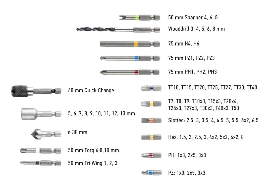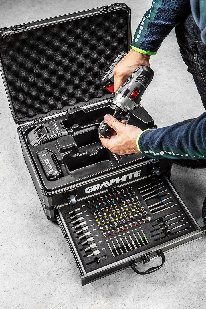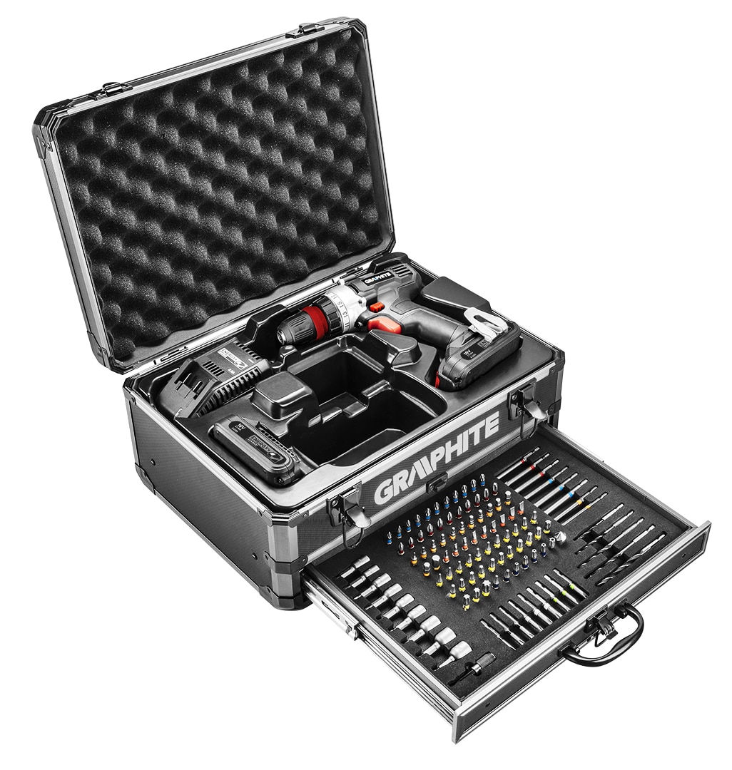 Zestaw Energy+ w walizce aluminiowej: wiertarko wkrętarka, akumulator Energy+ 18V, Li-Ion 2.0Ah – 2 szt, ładowarka. Zawiera 109 akcesoriów: bity 25 mm – 76 szt, bity 50 mm – 9 szt, bity 75 mm – 8 szt, wiertła do drewna – 5 szt, nasadki – 9 szt, fazownik – 1 szt, przedłużka – 1 szt
