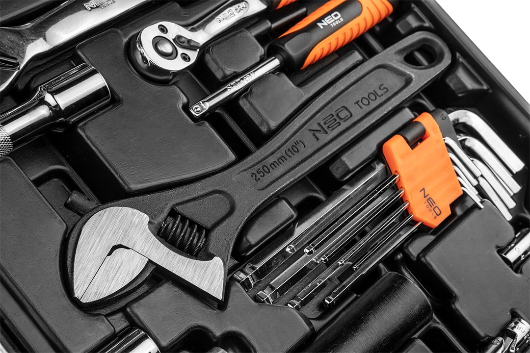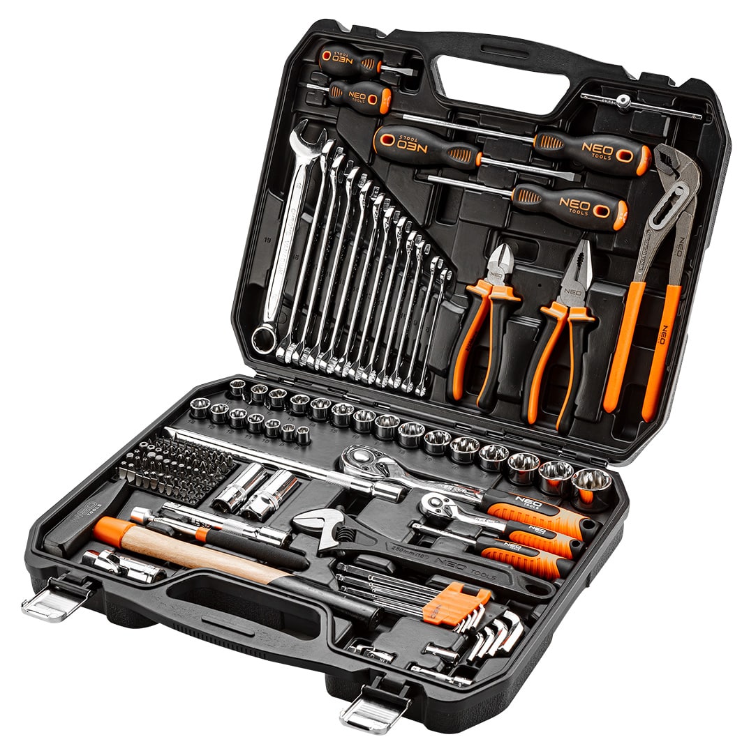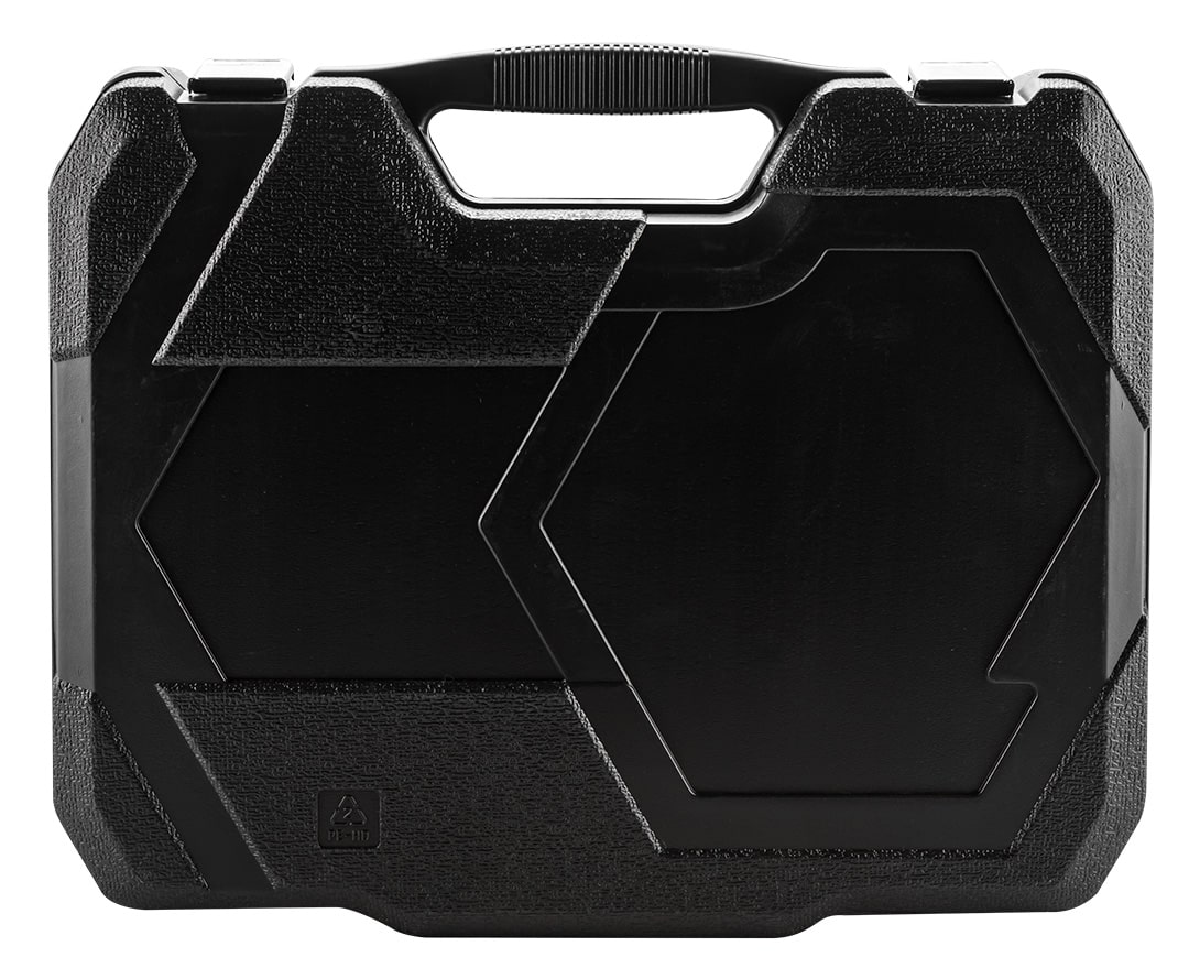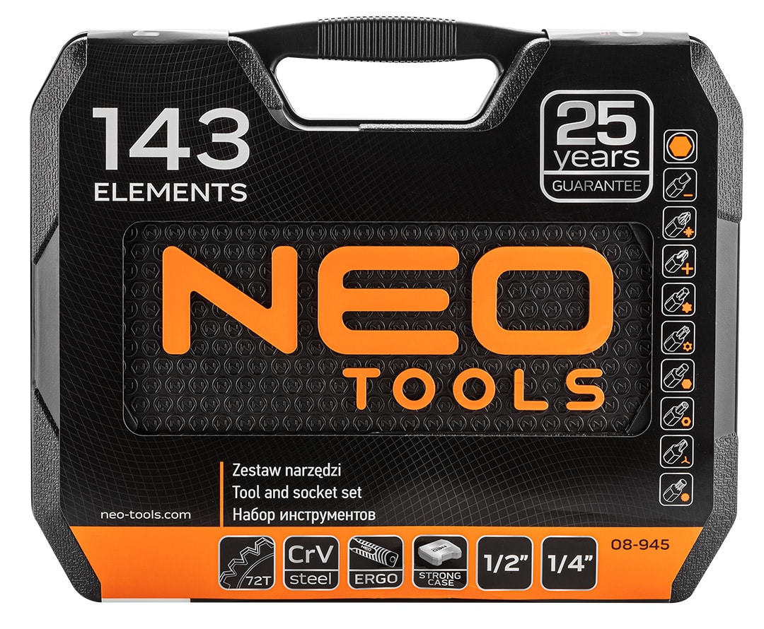 Zestaw narzędzi 143 szt.: grzechotki 2 szt. rozmiar 1/2, 1/4; nasadki krótkie rozmiar 1/2″ 15szt. : 10,11,12,13,14,15,16,17,18,19,20,21,22,24,27mm; rozmiar 1/4″ 7 szt.: 8,9,10,11,12,13,14; przedłużka 2 szt. rozmiar 1/2″ : 125 mm, 250 mm, rozmiar 1/4″: 50 mm; przegub 1/2″, 1/4″; nasadki do świec: 16 , 21 mm; bity 1/4″ 76 szt.; Pokrętło 1/4″; wkrętak do nasadek 1/4″; redukcja do bitów 1/4″ x HEX 1/4″; klucze płasko oczkowe 12 szt.: 8,9,10,11,12,13,14,15,16,17,18,19 mm; klucze HEX 9 szt.: 1.5, 2, 2.5, 3, 4, 5, 6, 8, 10 mm; wkrętaki płaskie FD5x38mm, FD6x100mm; wkrętaki PH1x38mm, PH2x100mm, PH2x150mm; szczypce uniwersalne 160 mm; szczypce boczne 160 mm; szczypce do rur 250 mm; młotek 500 g; chwytak magnetyczny 160 – 610 mm; klucz nastawny 300 mm.